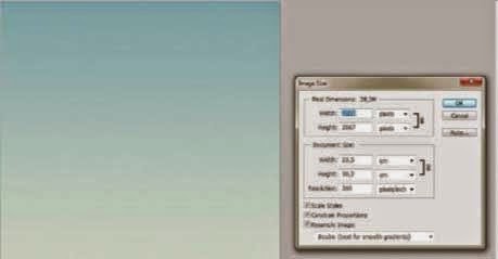 Create a new file 235mm wide by 302mm high at 300dpi. The background will be made using a gradient. Activate the Gradient tool and in the Gradient Editor choose a #e2ebdb colour in one Color Stop and #69adbf in the other. Then drag the Gradient tool line from the bottom edge to the upper edge.